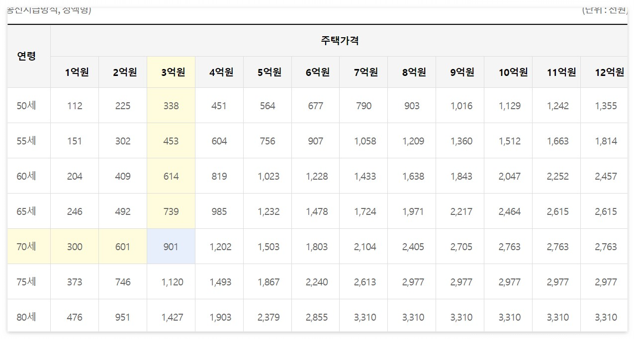 아래의 표는 월지급금 예시 표로 <일반주택 - 종신지급방식 >입니다. 표에 따르면 70세 부부가 3억 원 주택을 소지한 경우 월 90만 1천 원을 매달 받게 됩니다.