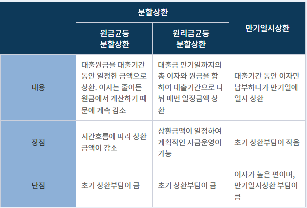 상환방식은 크게'만기일시상환', '원금균등상환', '원리금균등상환'으로 구분할 수 있습니다.