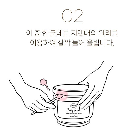 사해 소금의 입자가 피부의 불필요한 각질을 제거해 주고 식물성 천연 오일이 피부 재생에 도움을 준다고 합니다.