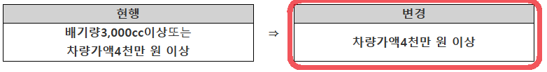 배기량 3,000cc 이상 또는 차량가액 4천만 원 이상으로 정하고 있는 고급자동차 기준 중 배기량 기준을 폐지하여 합리적으로 변경됩니다.