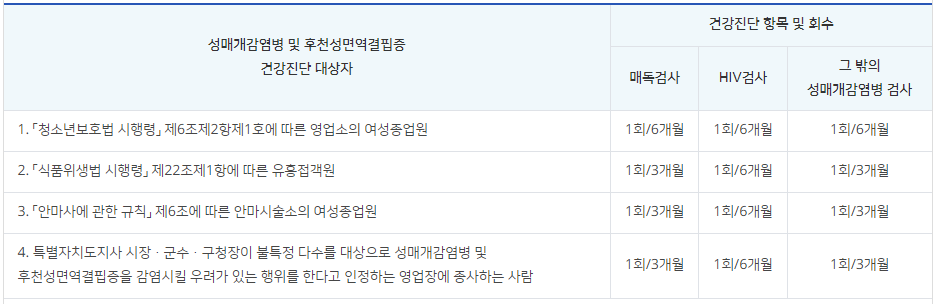 2) 성매개감염병 및 후천성면역결핍증 건강진단대상자 및 건강진단항목, 횟수