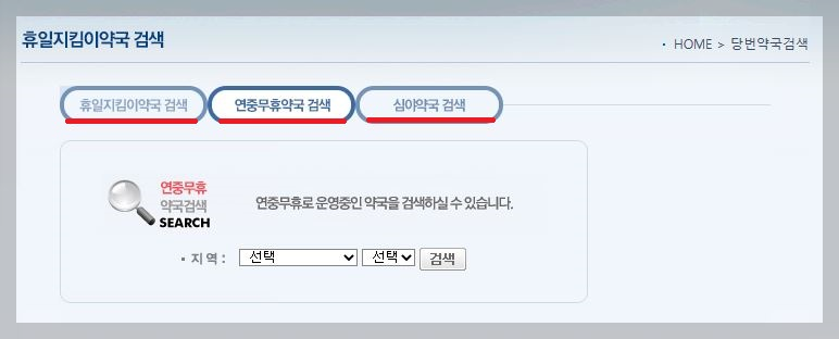 휴일지킴이약국 홈페이지에는 연중무휴로 운영 중인 연중무휴약국과 특정 시점에 운영 예정인 휴일지킴이약국, 심야에도 근무하는 심야약국을 검색할 수 있습니다.