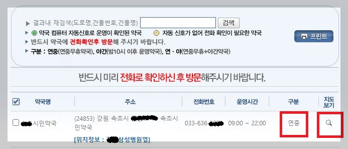 휴일지킴이약국 검색 - 검색을 한 후 아래의 화면처럼 결과가 나오면 표시되는 전화번호로 미리 확인한 후 지도 보기를 클릭해 위치를 확인하시면 됩니다.