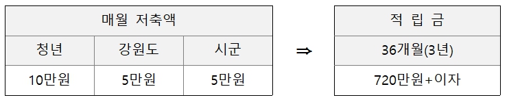 청년 저축액 대비 1:1 도·시군 매칭 지원으로 매월 10만 원 36개월 저축 시 강원도와 시군의 10만원 지원으로 총 720만 원 + 이자를 받으실 수 있습니다. 다만, 금융역량강화를 위해 재무교육 및 금융컨설팅 등의 교육을 연 1회 이상 필수로 이수하여야 합니다.
