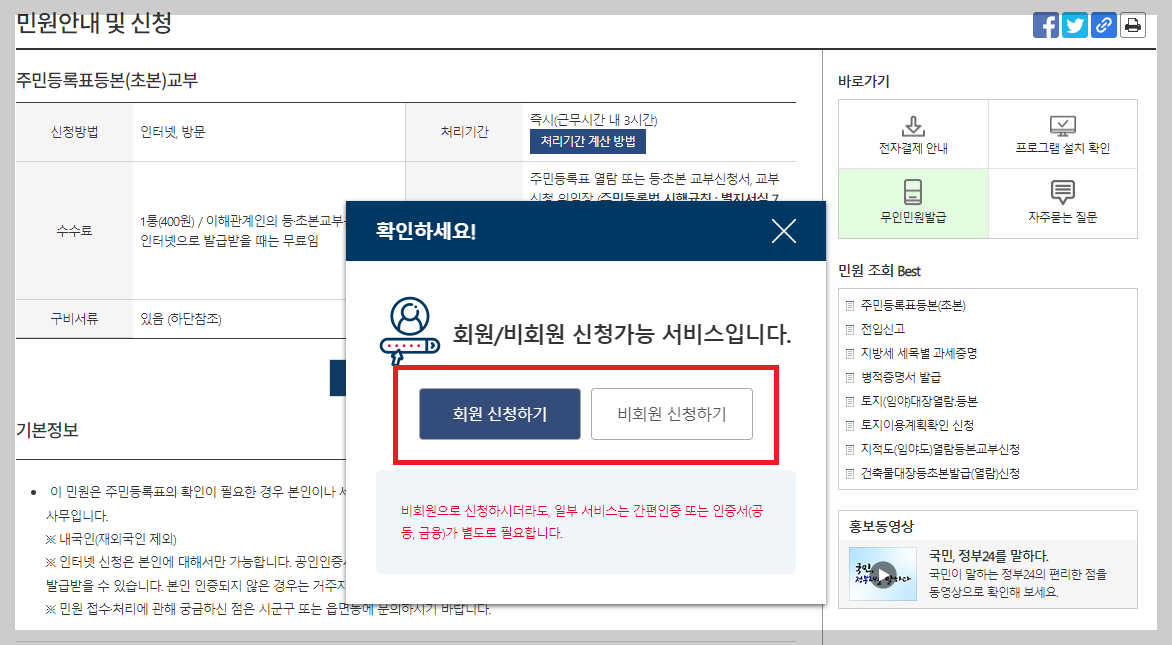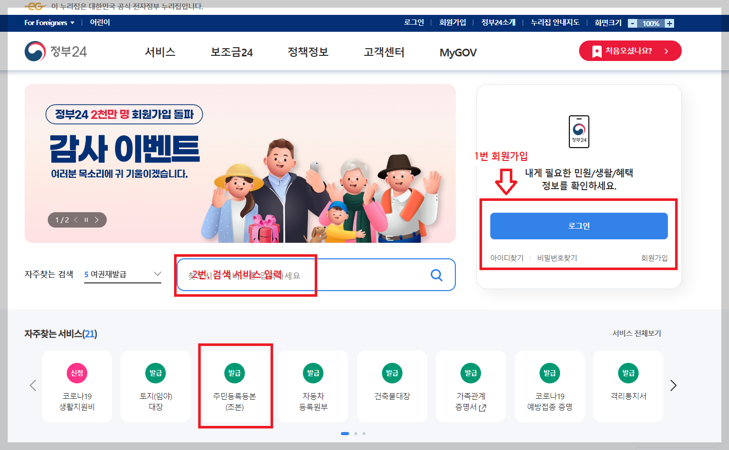 혹여 저 같은 분이 계신다면 회원가입 절차는 생략하시고 " 주민등록등본 발급"을 바로 눌러주세요.