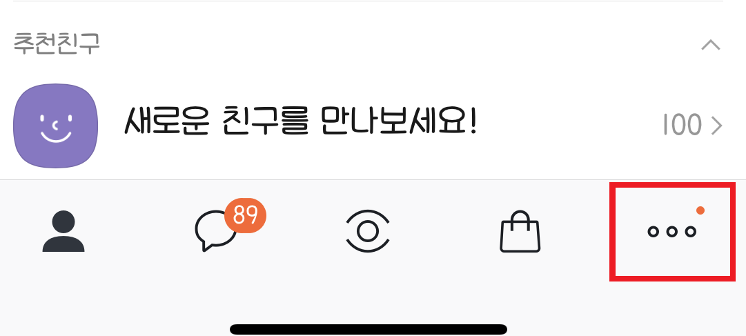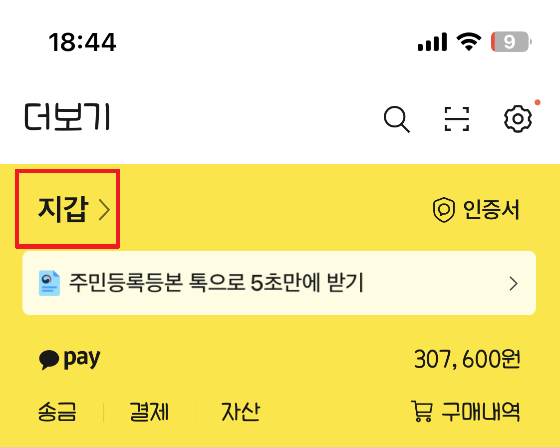카카오톡 가장 아래에 위치한 "○○○" 점 3개를 누른 후 더보기에서 지갑을 누릅니다.