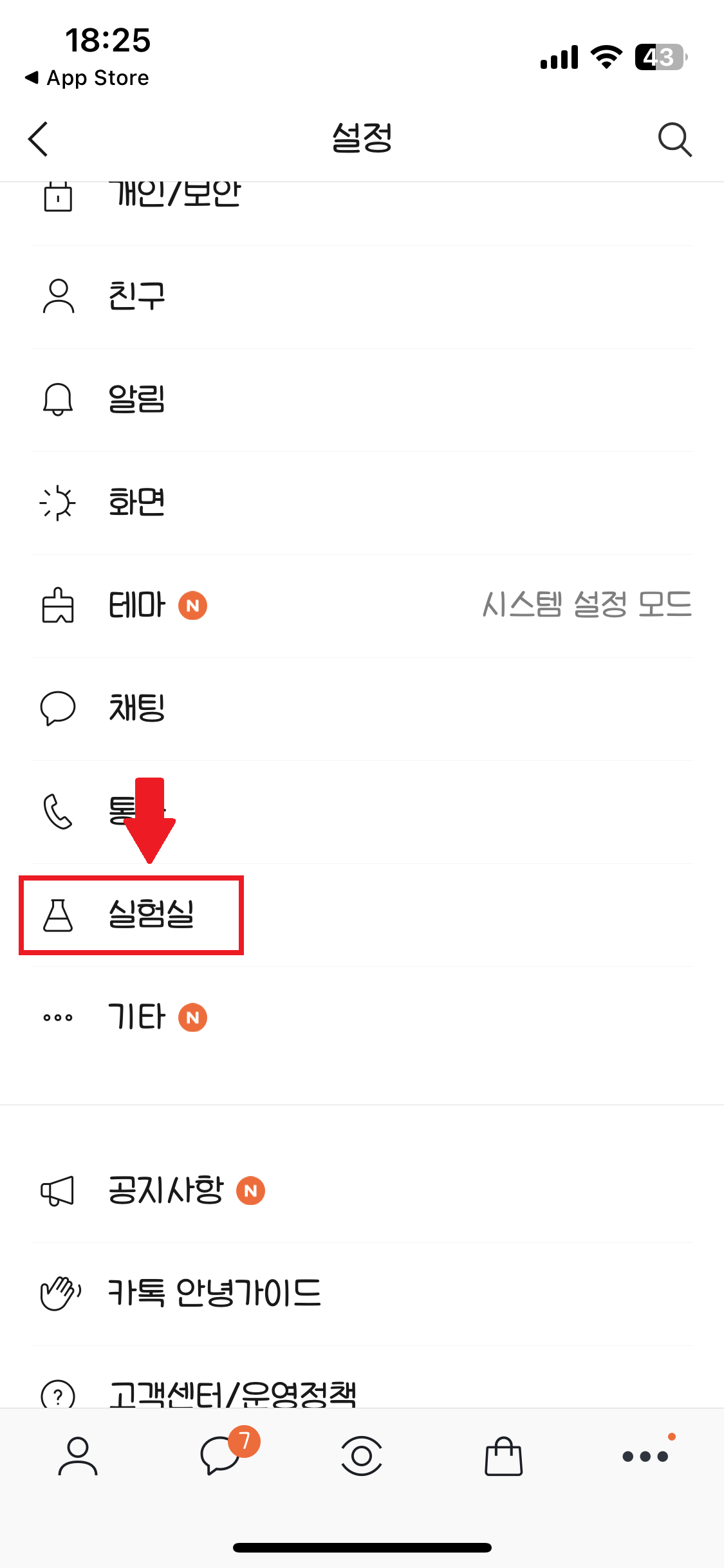 그럼 설정에서 실험실이란 탭이 보입니다. 누르세요.