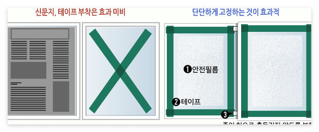 유리와 창틀 이음새를 테이프로 붙이는 방법이 효과적입니다.(한겨레신문 참조) 지하공간 이용자 행동요령