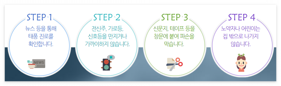 - 강풍으로 인한 피해를 입지 않도록 가급적 욕실과 같이 창문이 없는 방이나 집안의 제일 안쪽으로 이동합니다.