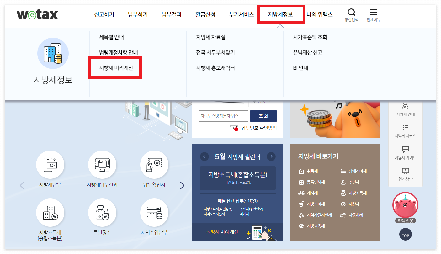 - 위택스 홈페이지 상단에 [지방세정보] 클릭 후 [지방세 미리계산]을 클릭합니다.