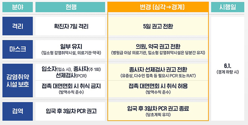 또한 방역전환 조치가 6월 1일 0시부터 시행됨에 따라 기존 격리 중인 확진자도 6월 1일 이후 격리의무에서 권고로 전환됩니다.